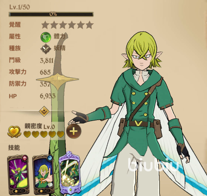 绿团,首发10连必出角色前期挺好用,后期基本只有打洞窟有点价值,被动血越少暴击越高,必杀有眩晕有使用价值。
