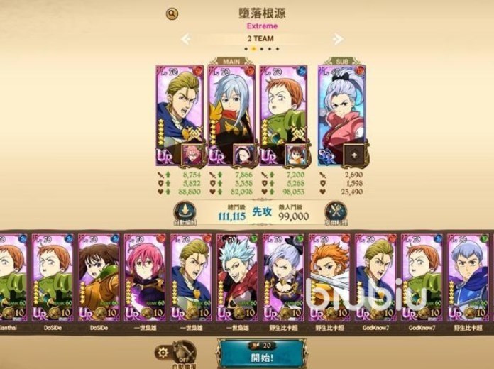 也可以绿团当坦,黛安打输出,王女被动补输出,蓝金净化外加补刀。这一套打到第五章也不成问题,尤其是在首抽得到绿团的情况下。搭配方案很多,还有金币高瑟+神速+蓝金+看板娘的搭配,金币高瑟加攻击、提升攻击、有控制有降低攻非常全能,神速大招能稳定切1个人,如果有其他的输出可以替换掉,蓝金有控制有补刀也是比较万用的角色。看板娘则是留着回血的,后期等有了一定资源后可以换成贯通队。