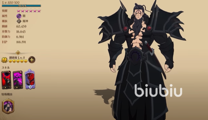 魔神王的1技能是很高倍率的单体伤害,3星的时候倍率能来到500%,而且拥有绝灭效果时还能在使用技能的时候攻击力提升60%,暴击率翻倍。2技能狱门刀,对敌全体攻击最高倍率可以来到350%攻击力,而且能赋予目标1(2)回合的“死之证”,这里的死之证是一种负面buff可以让目标的回复无效,并且暴击抵抗、暴击防御降低40%。