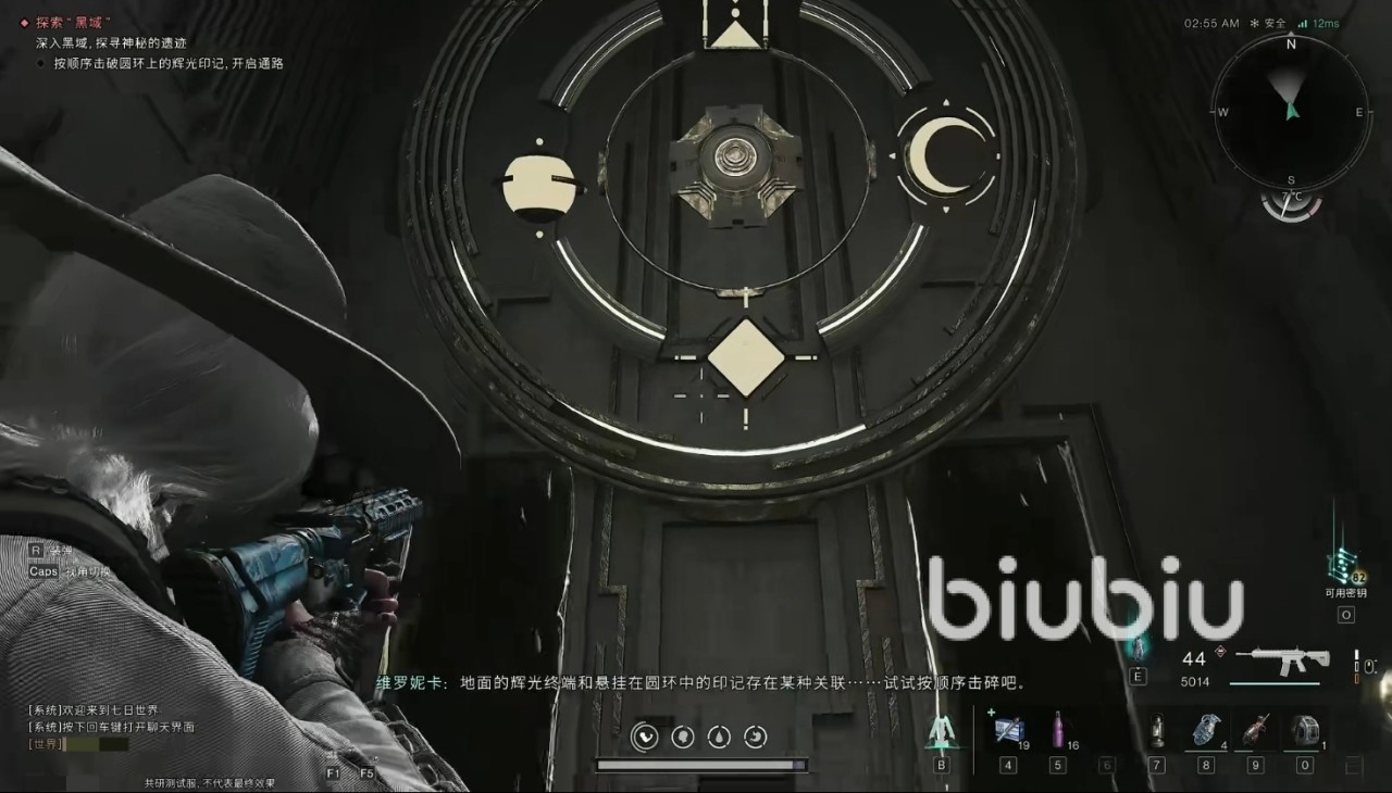 进入副本后,我们会看到上方有一个巨大的圆盘,四种图案分别是月亮、菱形、太阳、沙漏,这四个图案贯穿副本始终,大家要记住。第一个解谜,我们要通过正确射击圆盘图案来打开大门。两侧灯柱提示了击打图案和顺序(看灯柱上三角形的数量)。
