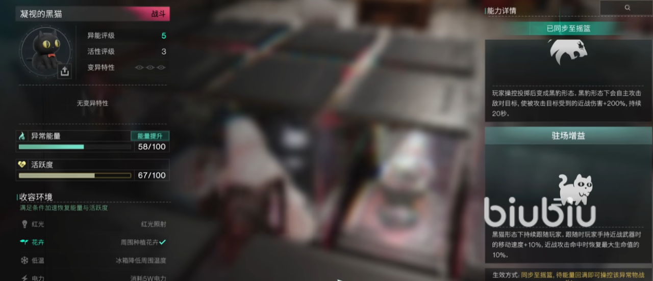 战斗类异常物,有机会在PVE剧本通关西塔隐藏关中获得。该收容物可在玩家投掷后变为黑豹形态,自动攻击敌人,并使其受到的近战伤害提升200%,效果持续20秒。在黑猫状态下会跟随玩家行动,若玩家手持近战武器,可获得10%的移动速度加成,并在攻击命中时恢复10%最大生命值。
