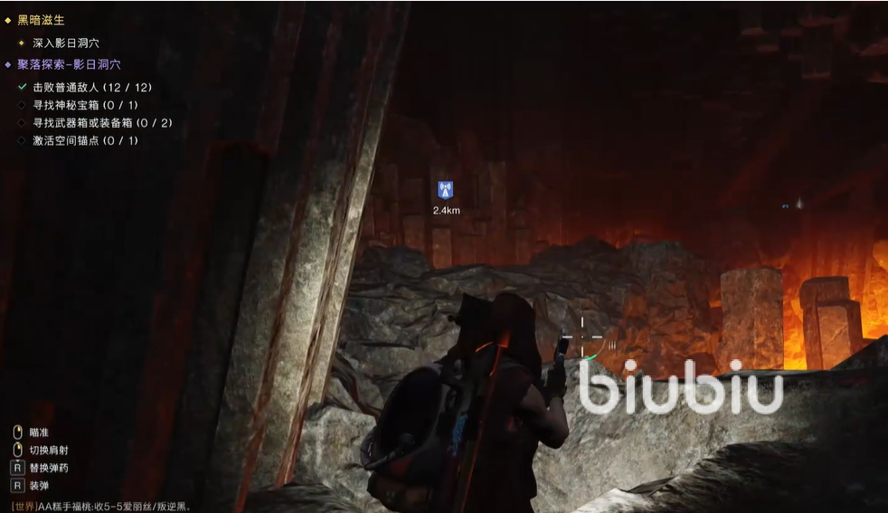 接着从这个地方出来,来到比较空旷的地点,在下面有很多明显的岩浆,这些岩浆会造成持续伤害,玩家们下落的时候需要寻找支点,然后在支点降落的时候能保证安全,这时候往前走,能看到很多的岩石阶梯,玩家们需要一步一步往前跳来到目的地射杀守护的小型boss,这个boss血量低很容易完成击杀,接着就能拾取宝箱。