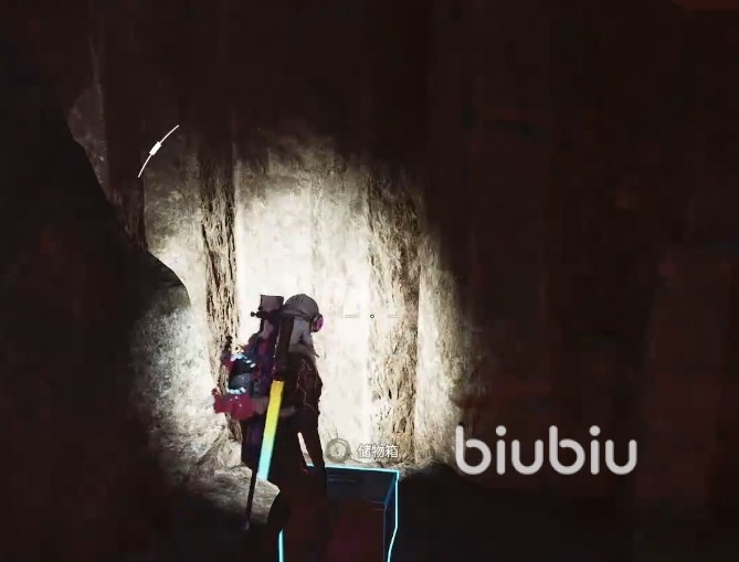 拿完后继续前进,这次需要一段矿洞路径了,在路上有很多的矿石,到达深处后有两个梯子爬上去后分别都有2个储物箱。拿完后转向另一边颜色较深的山体,在这里有一个很隐蔽的梯子,沿着梯子向上爬,上面还有几个储物箱和武器箱。