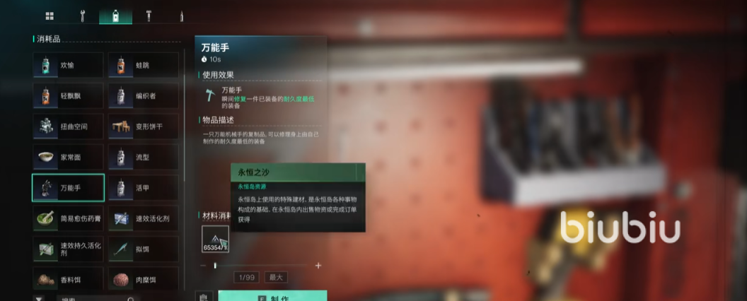 配方一般是通过游戏里的任务,探索,以及交易之类的方式去解锁的,这时候就能开始维修武器了,配方解锁之后,就能看到“匠师之手”生成的制作万能手所需消耗的材料,其中永恒之沙就是关键的资源,材料准备好后,就能在工作台上将万能手制作出来。