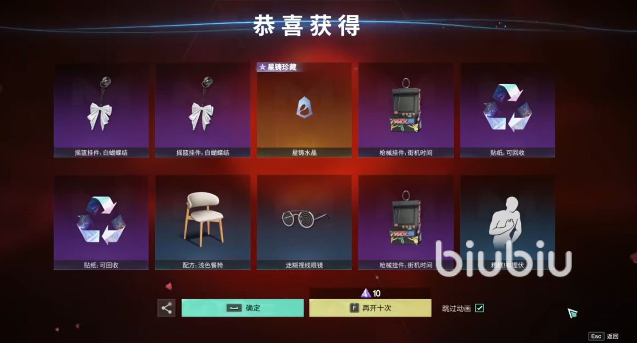 如果大家想要的话,可以直接抽取10次。那就有一定的概率获得不同品质的装扮道具或者一些特殊表情,另外还可以获得星铸水晶。这种东西可以在商店中兑换你想要的物品,要是某些道具已经拥有的话,那就会作为星铸余光回收,星铸余光可以升级成为星铸水晶,同样值得大家获取。