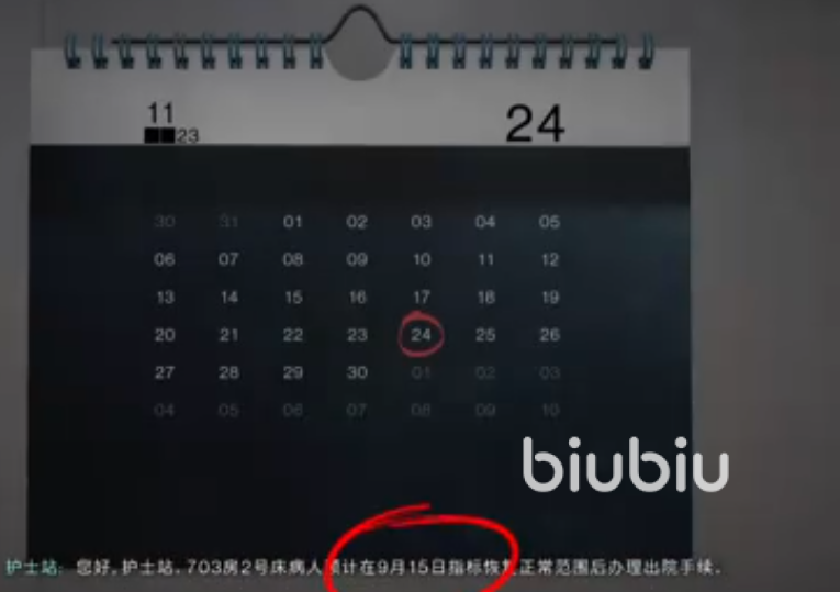 因为我们预计出院的时间是9月15日,而根据之前墙上面的日历,它上面显示的是11月24日,所以我们就需要进行一个调整,而想要调整这个日历,需要我们依靠跑动,能看到日历左右两边前后各有一个门。