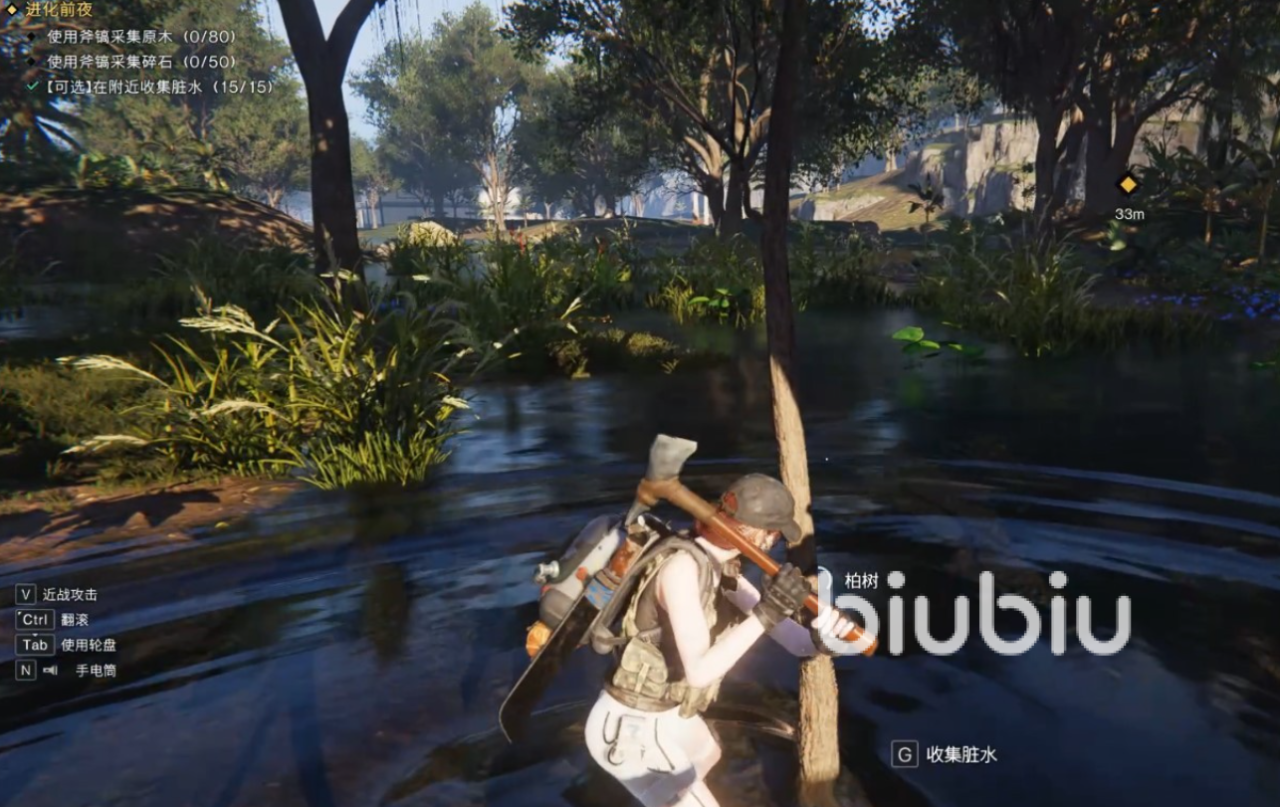 离开房间进入户外,这时主线会要求我们收集各种基础材料,我们先站在水池里收集脏水,等会可以用来制作成可以喝的水,然后用拿到的斧镐砍树和石头,能获得木头、碎石,这些会消耗我们的耐力,耐力不足会导致采集速度下降,想要恢复耐力可以适当休息一下,完成资源收集后就能在野外建造出临时营帐,也可以制作一些简单物品,作为重生点,每个人同时只能放置一个,如果放一个新的话,那么原本的旧的就会被拆除,而且材料不返还,在里面安装一个简易的工作台,能制作简单的装备、料理等,用于在野外探索时的简单休整;