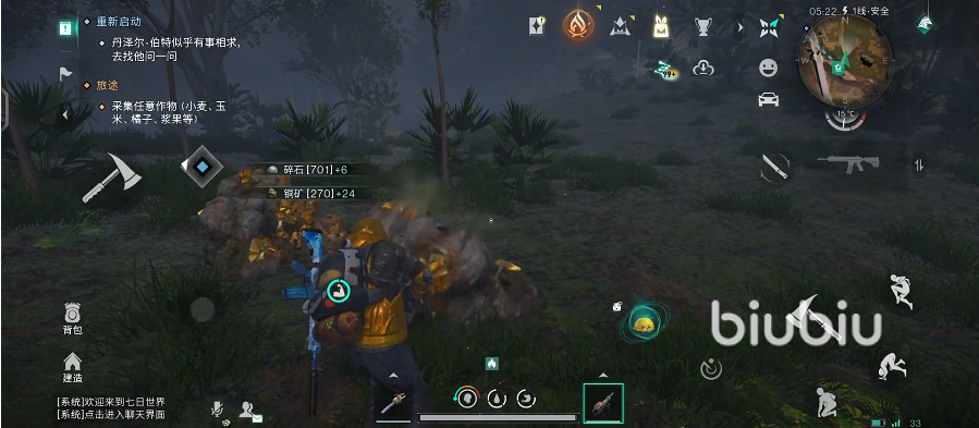 首先比较重要的就是木材和石头的基础资源,游戏时,可以利用拳头砸树来获得树枝,这也是刚落地能获得木材比较高效的方式,在收集了一定数量的树枝之后,就可以制作石斧,石斧这个工具的制作,就能大大提高大家接下来获得木材的效率,快速的砍树获取更多的树木,而石头也是能通过拳头采集的,后面也有可以制作的工具来提高采集效率。