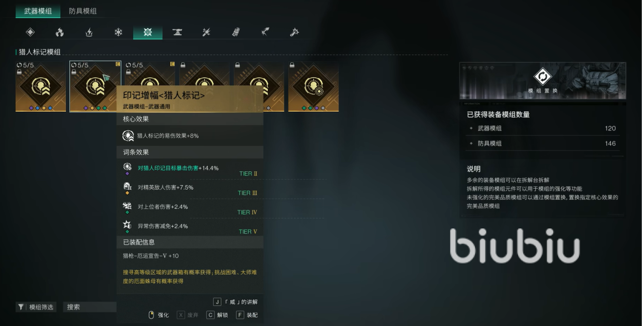 武器模组方面的话,这里优先选择印记増幅<精准>。不仅可以提升易伤效果,又可以增加弱点伤害和枪械伤害,所以可以轻松增加不同乘区的伤害。副武器上的模组推荐用持续快枪<快枪手>,可以让你在快枪手状态下,提升状态持续时间以及伤害。