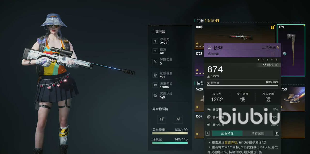 近战武器推荐大家带一个长斧:重击每命中1个目标,所有武器暴击率+8%,近战挥砍速度+5%,切换武器后就可增加主武器的暴击伤害。