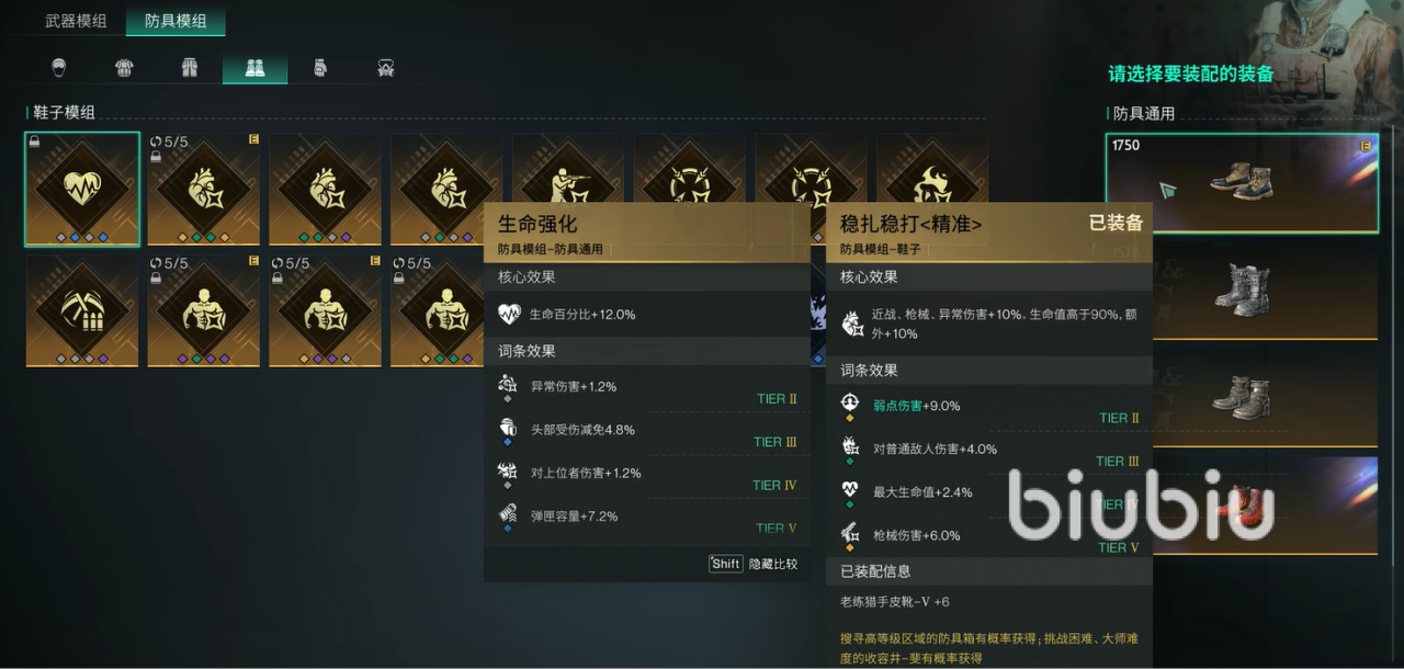 至于头部模组的话,就推荐大家用精准打击,同样可以增加弱点伤害。衣服模组的话,可以选择快速返场,可以提升弱点伤害的同时还带来庇护效果,增加生存能力。裤子模组的话,就可以用百步穿杨<精准>,同样可以提升弱点伤害。最后鞋子的话,就可以选择用稳扎稳打,除了可以提升弱点伤害之外,还能增加额外10%伤害,更令人喜爱!