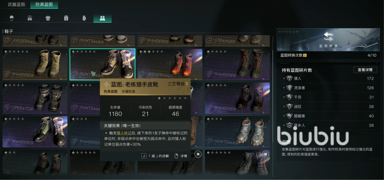 鞋子上的话,可以选择老练猎手皮靴。当你触发猎人标记后,接下来的一发子弹命中被标记的单位时,非弱点命中也被视为弱点命中;且对猎人标记单位弱点伤害加30%,这个效果非弱点命中也被视为弱点命中,就算boss本身没有任何弱点,依旧可以在他身上打出弱点伤害。