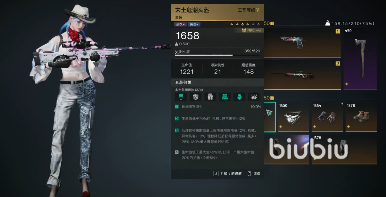 至于装备方面的话,推荐大家用三件末日套,分别是头盔+鞋子+手套。可以带来高额伤害减免提升,增强自身的生存能力;然后还可大幅度提升爆炸和枪械伤害,并且理智、血量越低,伤害加成也就越高,让你轻松实现逆风翻盘。
