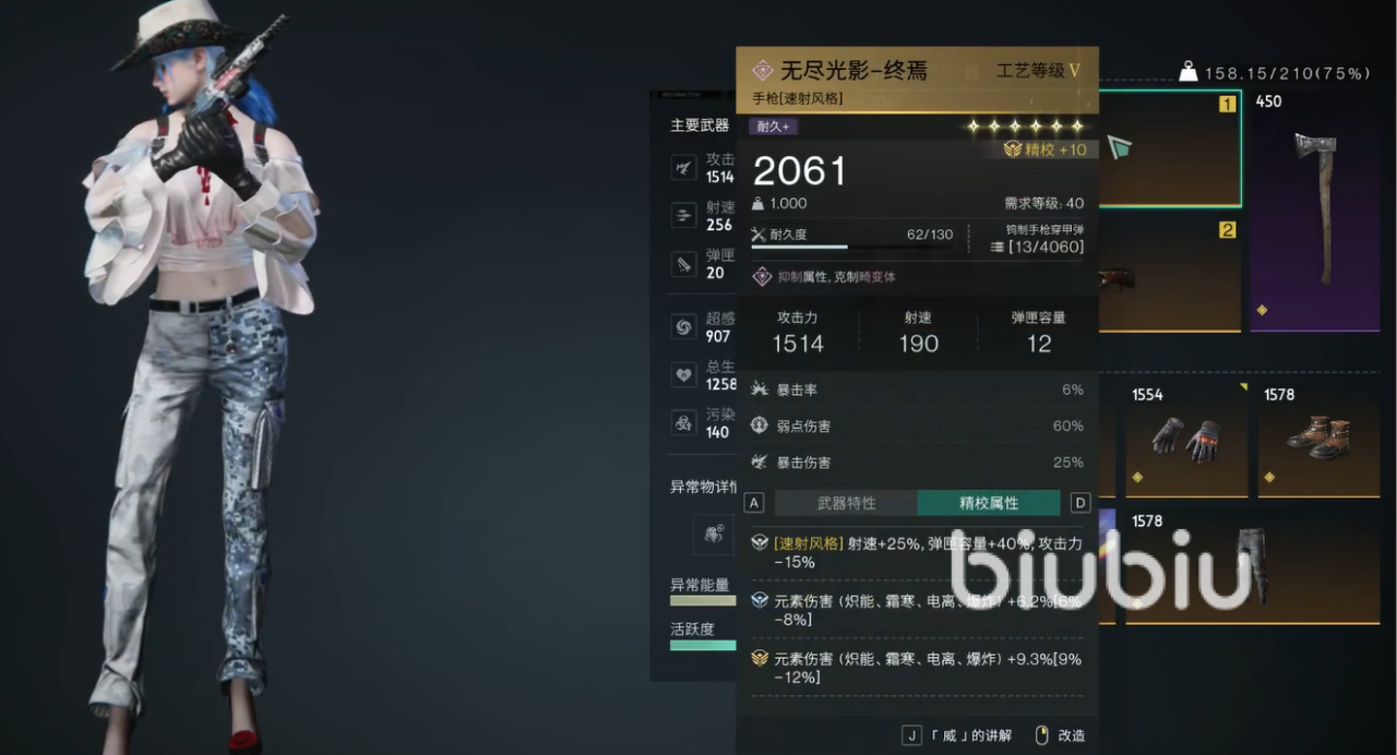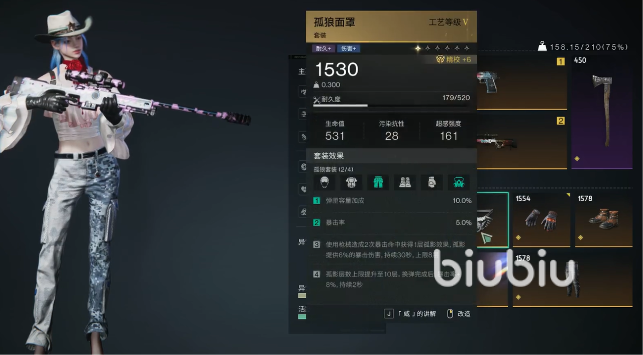 之后还可以搭配孤狼两件套(面罩+裤子),可以让大家获得10%的弹匣容量加成,以此增强持续输出能力。然后还可进一步提升暴击率,让大家可以轻松打出多发暴击伤害。关键防具可使用萨满秃鹫上衣,触发不稳定爆弹后,暴击率+35%,持续3秒。