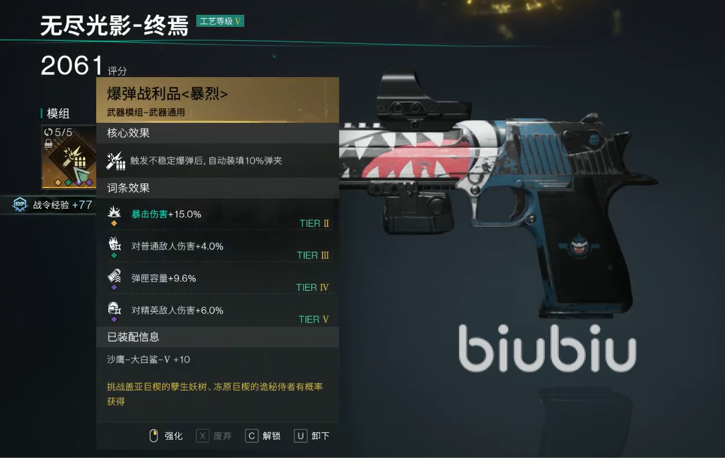 首先大白鲨的全名叫做无尽光影-终焉,由于外表酷似大白鲨所以才因此得名。它的武器特性可以让它命中敌人时,可以触发不稳定炸弹,并且增加爆炸元素伤害并增加暴击率,是一把爆发伤害特别高的武器。属性方面为速射风格,能增加弹匣容量并迅速射击。