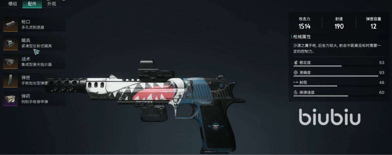 武器配件方面的话,可以使用枪口多孔式制退器+瞄具紧凑型反射式瞄具+战术集成型激光指示器+弹匣手枪加长型弹匣+弹药钨制手枪穿甲弹。由于后坐力较大,射击中距离目标时需要一定的控制力,所以必须提升它的稳定性以及精准度,并且可以提升射程和换弹速度。