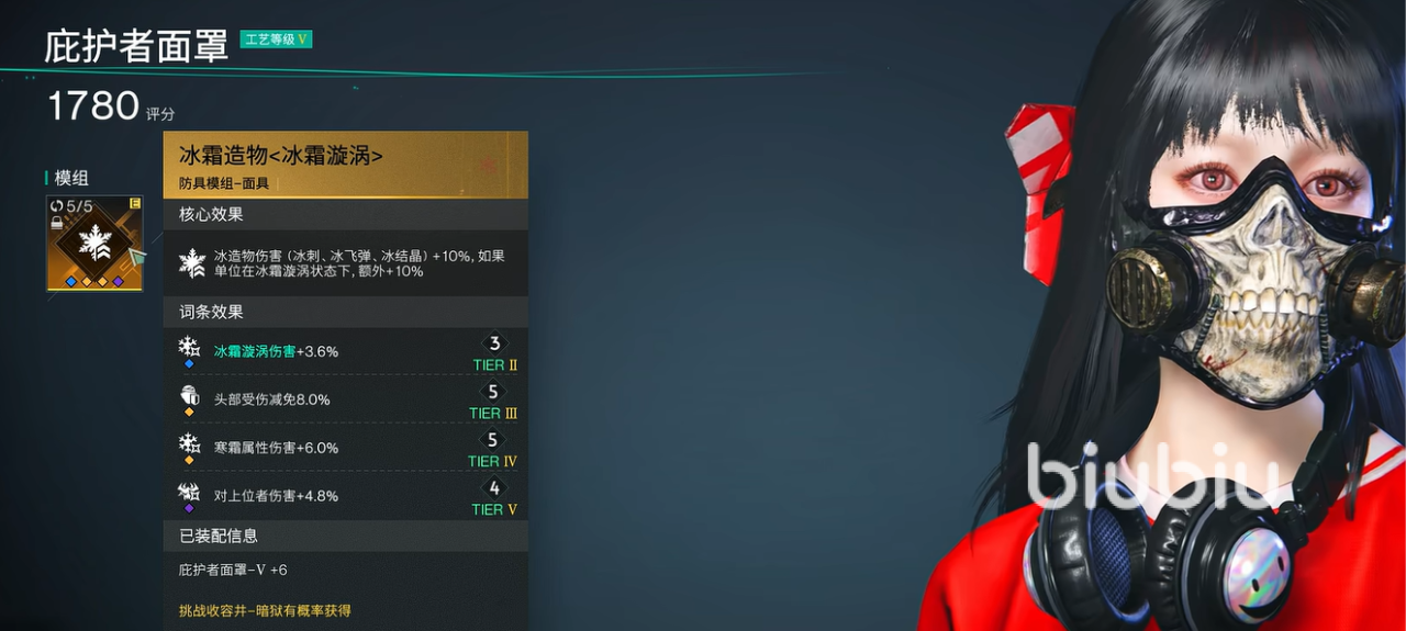 头部模组选择异常强化,可以增加10%的射速和20%的异常伤害加成,这时就可以将大家的射速提升至825。这已经是非常够用了,所以后面的图纸就不需要再带射速。面罩模组可以用冰霜造物,可以给冰晶飞弹增伤;如果敌方在冰霜漩涡里面,再额外加10%的伤害。