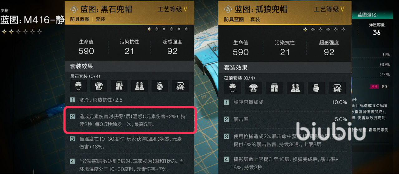 这里推荐大家直接用黑石四件套,套装效果的话,可以提升35%元素伤害,增强极端天气抗性。黑石面罩可以延长冰霜持续时间,也可以用孤狼面罩替代,+10%弹匣容量;接着可以用黑石上衣(提升异常伤害)或判客外套(+15%换弹速度),裤子则可精准充能(弱点命中率提升元素伤害)。