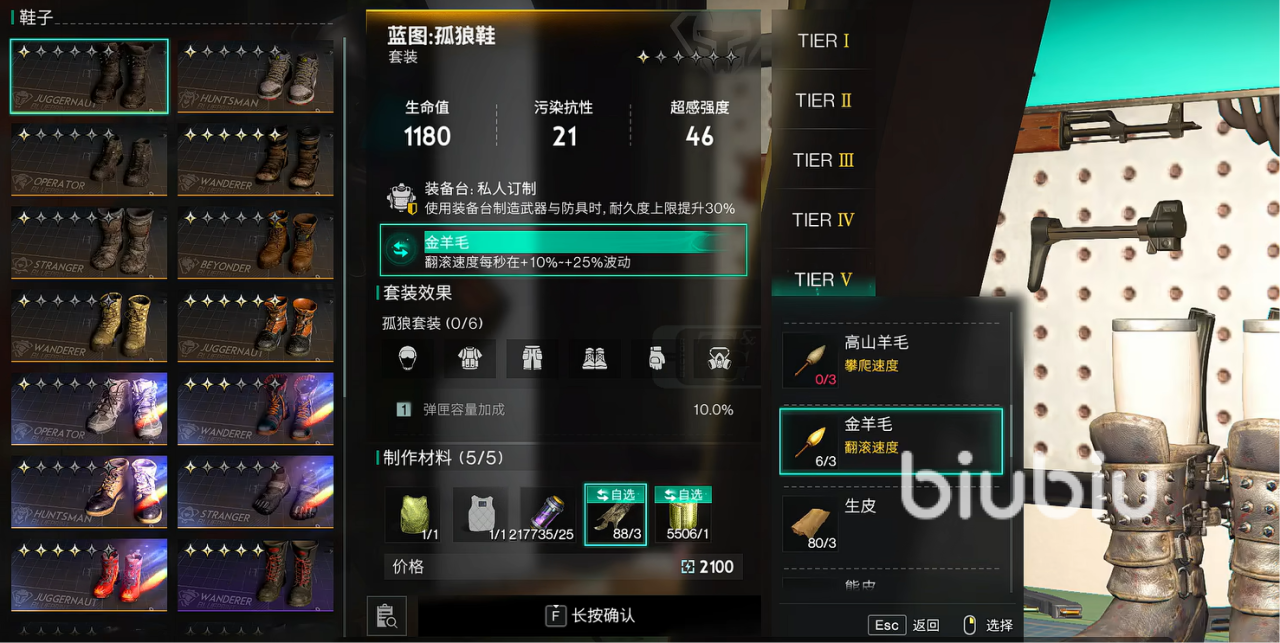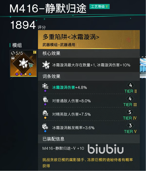 鞋子模组建议使用金羊毛加翻滚速度,因为后面移速和冲刺其实不是很缺;但是如果不翻滚的话,那就可以继续用荒原狼皮,其他部位任意皮毛即可。枪上面的模组有两个选择,分别是冰霜守护和多重陷阱。冰霜守护的效果是:每次漩涡消失时,就可以恢复10%的生命值。