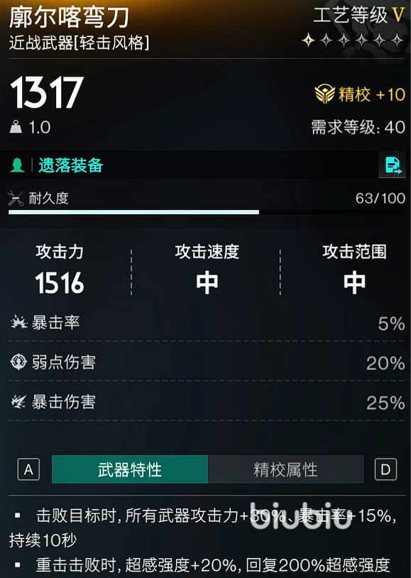 副武器推荐大家用廓尔喀弯刀,作为一柄轻击风格的近战武器,重击砍碎冰块的效果,可以给大家带来30%的易伤效果,进一步增加静默归途的输出伤害。另外还能提升20%的超感,更加容易打出碎冰等元素伤害。