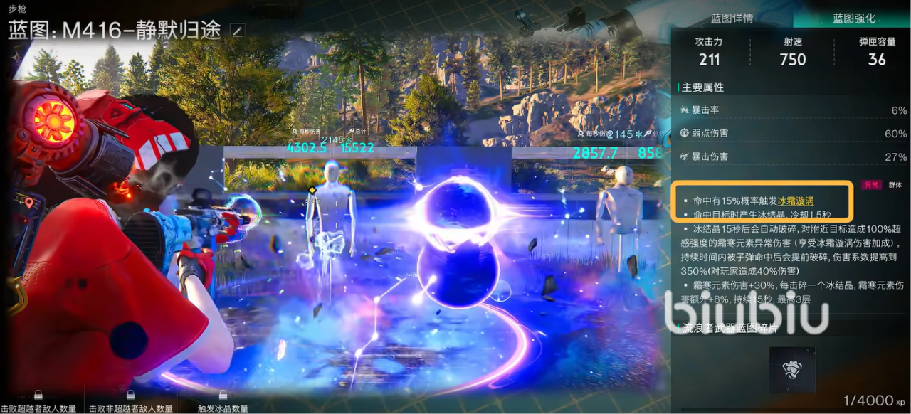 这把武器的特性叫做冰霜旋涡,命中敌人有10%概率触发冰霜旋涡,持续造成寒霜伤害。第二个特性可以造成冰结晶,并且在15秒后自动破碎,造成额外伤害,若被提前击碎则伤害提升300%。第三个则是寒霜增伤:每击碎一个冰结晶,寒霜伤害额外提升10%,最高叠加4层。