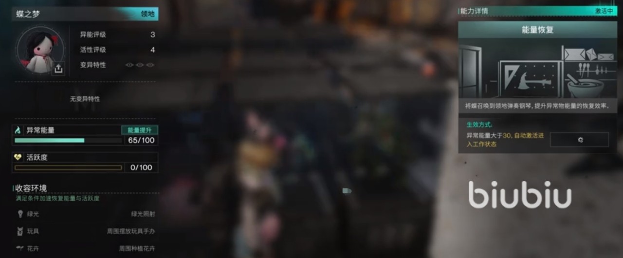 在大家成功收容后,蝶之梦会召唤“蝶”在领地内弹奏钢琴,这样就能进一步去提升异常物能量恢复效率,需异常能量>30时自动激活, 周围放置玩具、花卉或绿光照射更是能进一步加速能量的恢复,还是比较适合长期养成的,优化领地方面的资源循环,提升其他收容物的活跃度。