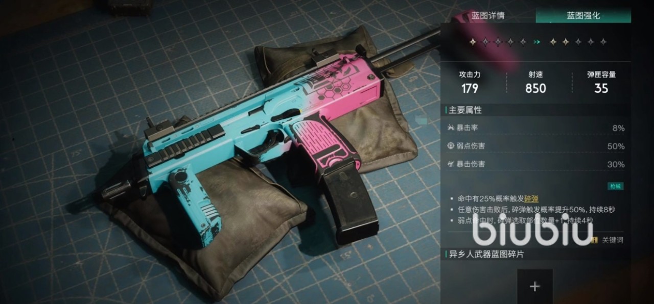 游戏设定中,它是一把高射速的冲锋枪武器,对于新手来说还是比较友好的,高射速的效果下,能让其不论是pve还是pvp方面都能有个稳定的表现,同时命中敌人后可概率触发碎弹的效果,击败敌人后更是会进一步去提升触发的概率。