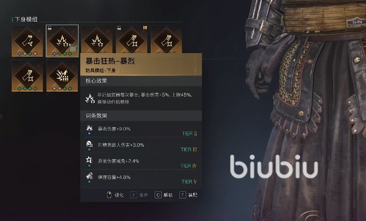 模组方面,可考虑电涌伤害提升元素反应伤害,然后弹夹容量进一步减少换弹频率,提升持续输出能力,当然还有一个异常能量回复来保障收容物活跃度也是不容忽视的,这样就能进一步去增强战场控制。