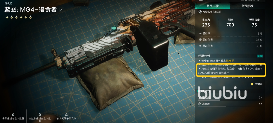 该武器推荐的原因之一也是获取比较方便,前期就能拿到,同样作为轻机枪,它的攻击力虽然没有爆炸那么强悍,但是攻击力也是相当不错了。其他的数值也是比较均衡的。它的特性,就是在每次命中敌方单位时,有40%的概率触发快枪手的效果,这个效果可以让攻击速度得到较大的提升,而且最多可叠加5层,并且还能得到无限子弹的效果,如果持续的攻击同一目标,后续的伤害还会增强,不管是对单,还是对群都是值得信赖的选择。