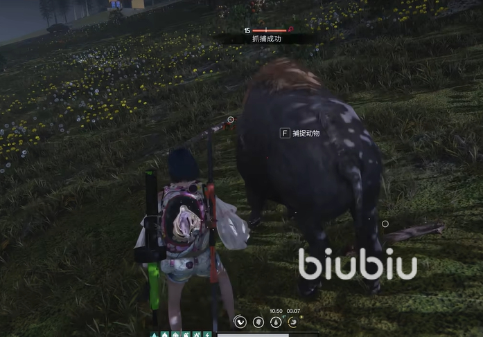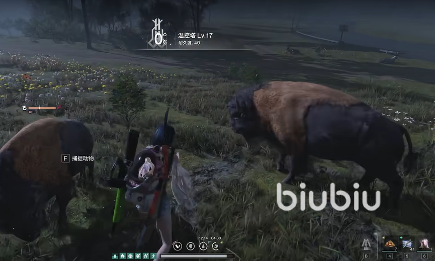 抵达传送塔以后,玩家们只需要往山坡方向走几步,这时候需要在背包中放置野兽的捕捉器,然后到达野牛附近,使用f键位就可以完成捕捉了,整个捕捉过程不需要使用任何的陷阱,野牛生物属于没什么攻击性的,只需要悄悄靠近就能完成野兽的狩猎了。
