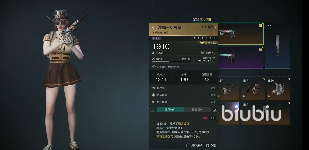 作为唯一一把金色品质的沙鹰系列枪械,它一出场就受到了众多玩家的喜爱,大白鲨的面板属性也着实优秀,光基础攻击力就有788点,射速是190,弹匣容量是8,在初始状态下,它的暴击率就有6%的暴击率以及25%的暴击伤害。