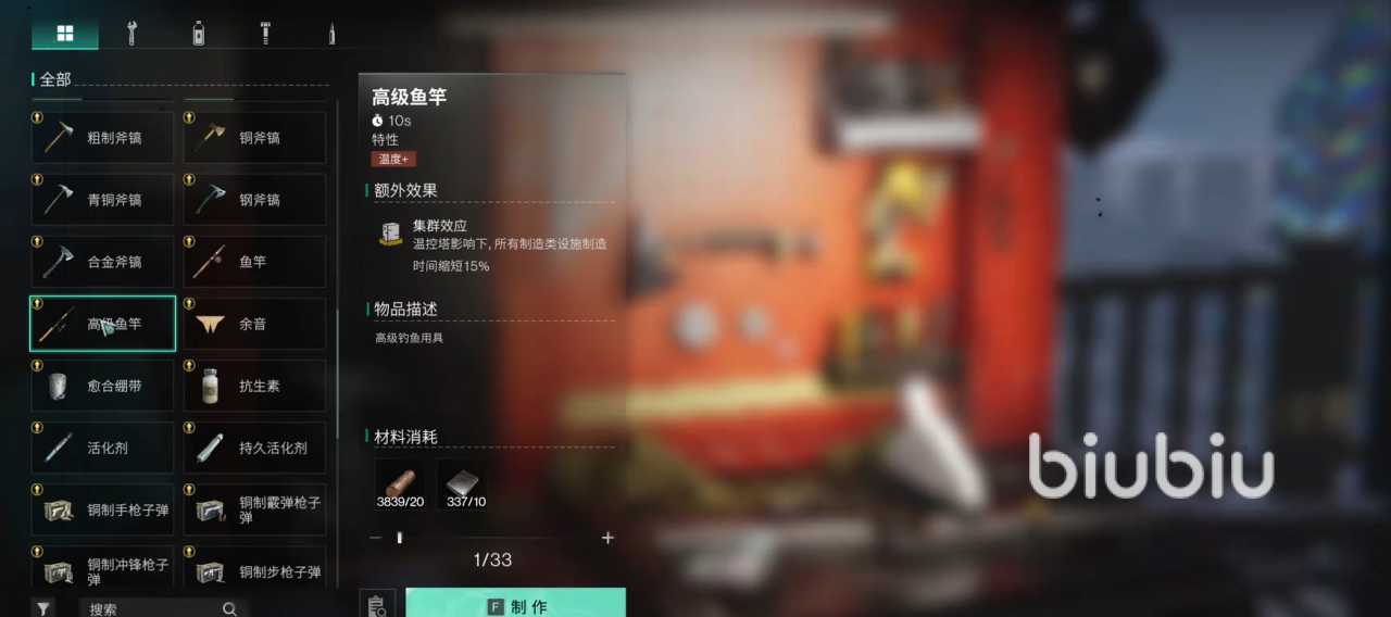 各位玩家需要确保拥有制作所需材料,大家可以通过游戏过程累计、探索事件或完成任务获得。这些材料可能包括木材、金属等,然后回到家中,大家就可以在工作台使用配方制作高级鱼竿了。