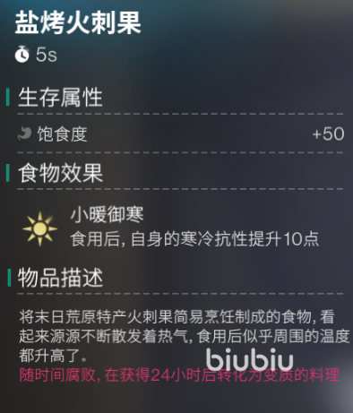 最后在冰天雪地中,一些食物不仅能增加饱食度还能给我们加温暖,比方说盐烤火刺果就是其中的一种,烹饪方法也很简单,在野外见到火刺果并准备好盐和火堆就能制作成功。