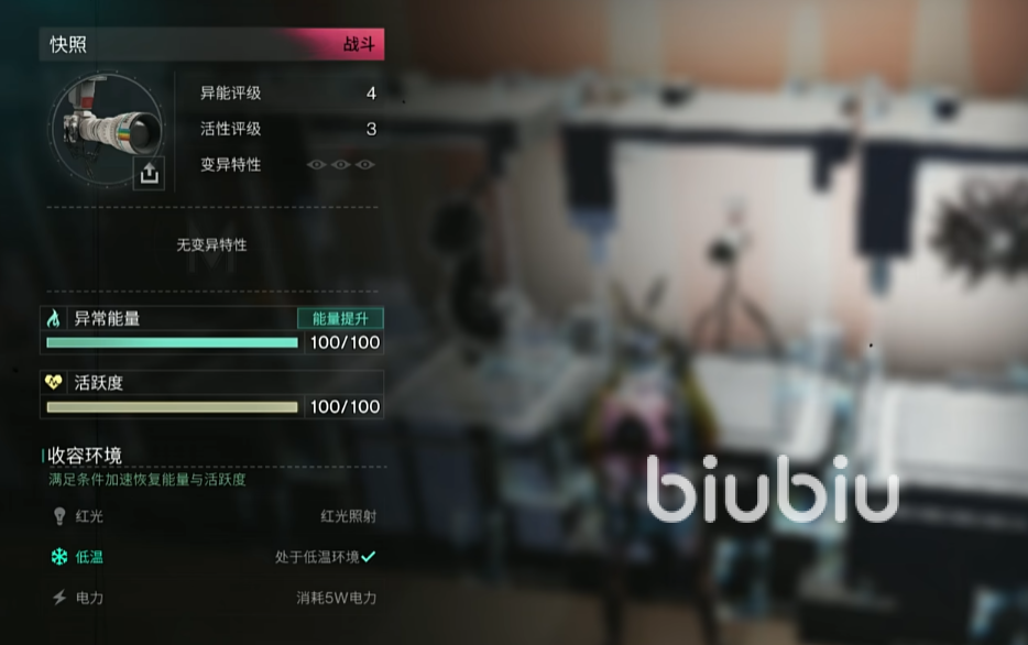浮光蓝(战斗类):命中弱点额外增加1点收容度,冷却3秒。在世界探索或收容井中发现。