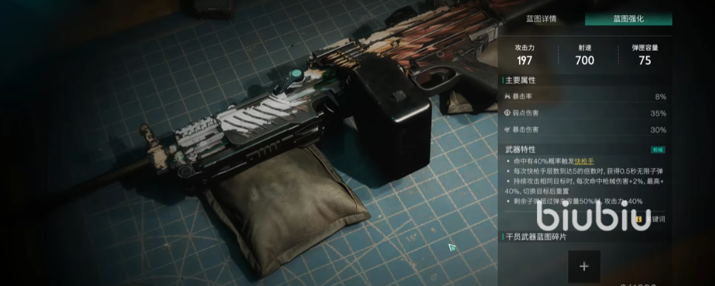 而如果后续加上了全面的配件,射击速度能够达到700,射击速度非常之快,并且短时间能发射出多枚子弹,使用起来手感非常的不错,伤害也非常的充足。通过无限子弹的叠加,就能对敌人造成超高的损伤,非常强大。