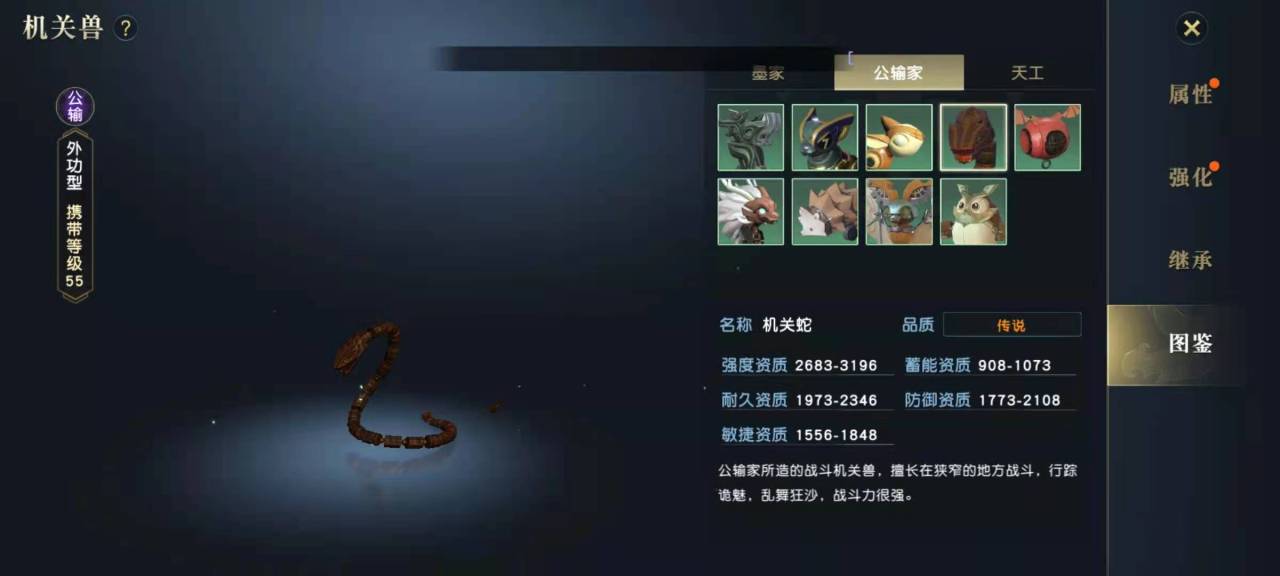外功型机关兽建议选择机关蛇,传说品质的机关蛇可以达到3190多点强度资质,2100多点防御资质,成长是1.053,作为攻击型机关兽而言已经非常不错了。均衡性机关兽可以选择机关刺猬,传说品质的机关刺猬能达到4127点耐久资质,2219点防御资质 ,对于整体属性的提升还是很大的。合体机关兽可以选择均衡性,出战机关兽选择外功型的。