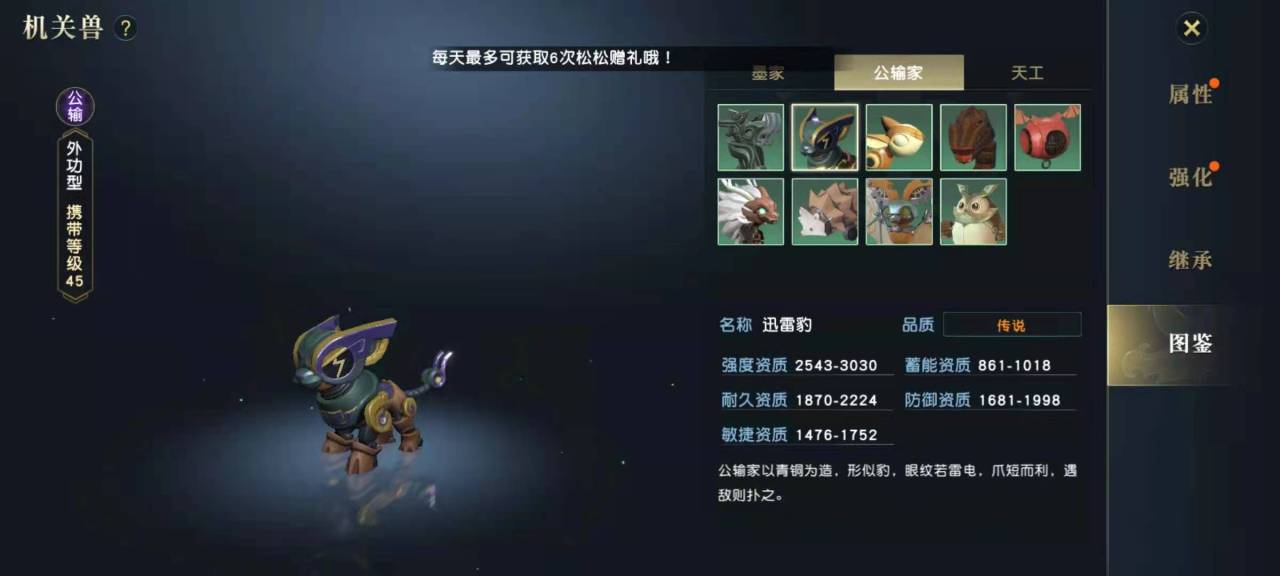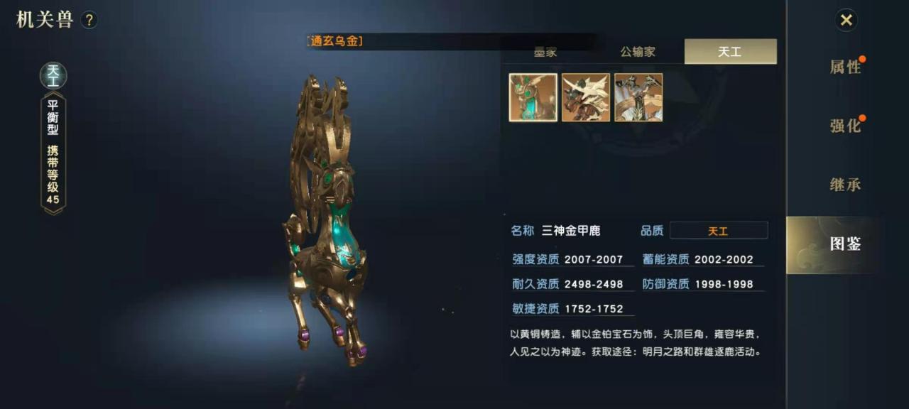 还有一种就是天工机关兽,也就是橙色机关兽,其中的三神金甲鹿非常适合儒家携带,橙色机关兽就有了天赋,三神金甲鹿的天赋可以为附近的队友持续恢复血量,在打团本的时候是非常好的助力。
