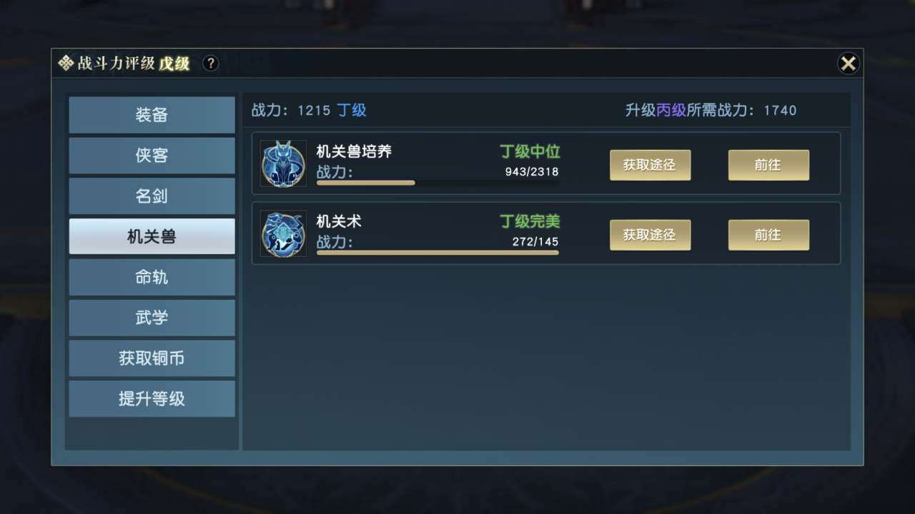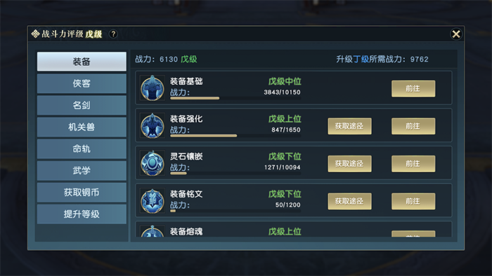 在主页面的头像旁边有个变强的图标,点击进去就能显示游戏给提供的所有提升战力的途径。主要包括有:装备、侠客、名剑、机关兽、命轨、武学这几个方面。其中又以装备的提升空间最大。