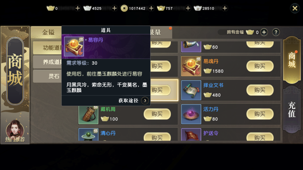 需要注意的是易容丹的需求等级是30级,也就是易容需要30级以后才能进行。易容丹上的描述是,千变莫名,墨玉麒麟,使用后,前往墨玉麒麟处进行易容。道具上的描述是比较简洁的,并没有透露太多的信息。易容丹这么高价值的物品,如果在游戏没有曝出能在易市进行金镒出售的物品,不进行充值是得不到这么多的金镒的。就会有先找NPC看一下功能的想法。那么墨玉麒麟在哪儿呢。
