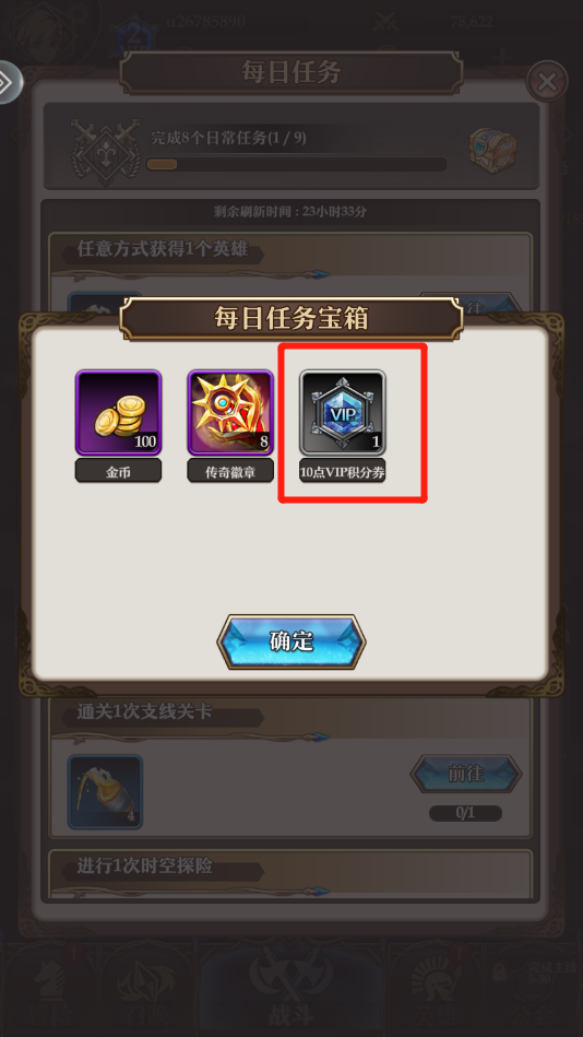 (4)每日任务:上面回去VIP经验的方法都是一次性的。只有完成每日任务是可以一直获得的VIP经验的。不过增加的比较少,每次只能增加10的VIP经验,但是极少程度,毕竟是白嫖来的VIP,那么厉害的英雄重要比别人多付出些努力才是。