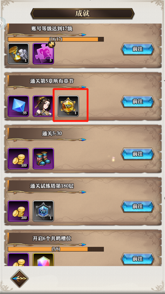 (3)成就任务:完成成就任务就能得到大量的VIP经验,单单完成第五章的成就任务就能得到100的VIP经验。