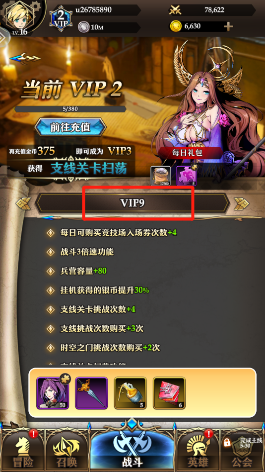 (2)爬塔获取:爬塔中的成就任务可以得到不少的经验值,小编的VIP等级就是这样来的,每过十层就能领取一定的VIP经验,有毅力的玩家努力爬塔吧。