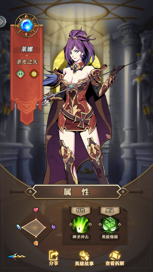(1)莱娜圣光之矢:莱娜的全名叫做莱娜圣光之矢,他的普通攻击速度降低50%,但普通攻击伤害更高并会触发神圣冲击,对敌人造成70%政击力的范围法术伤害。
