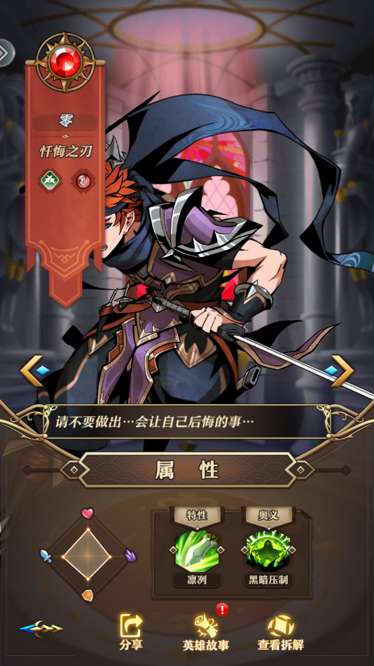1、零忏悔之刃:零是全能型英雄,无论是竞技场还是副本都是首选角色,也是氪金玩家的首选。零的减防御是游戏中非常稀少的,可以说是从头用到尾的影。