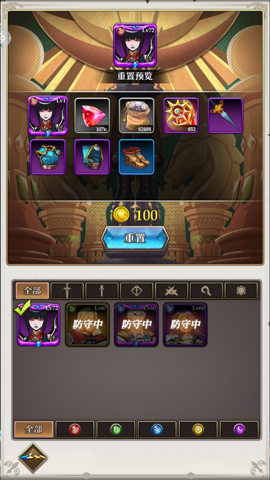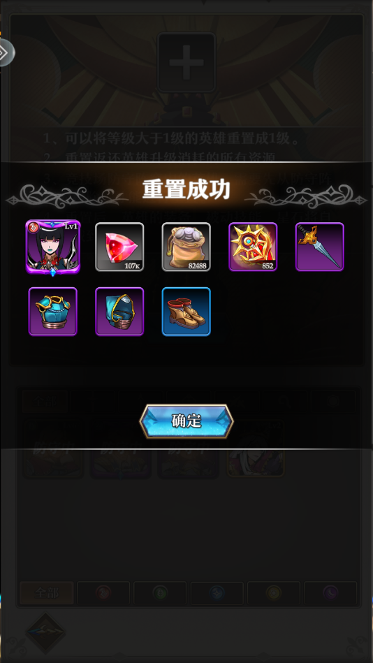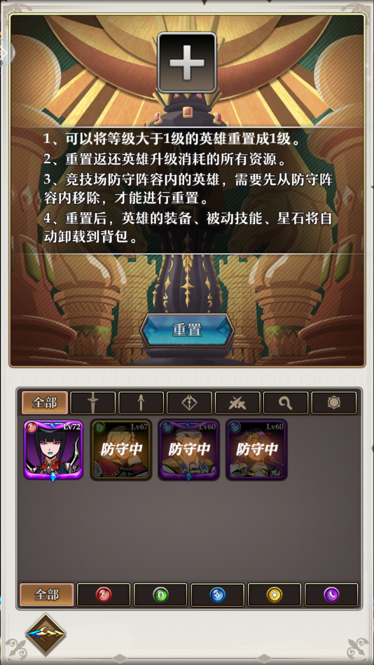 2、角色重置之后,角色所携带的装备自动放入背包当中,如果背包此时是满的,那么将无法使用英雄重置操作。