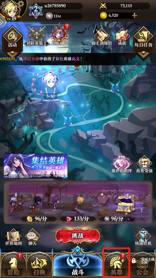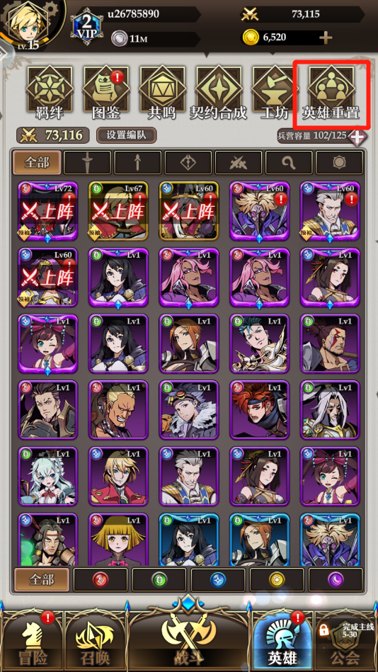 1、首先进入游戏的主页面,点击最底下的“英雄”按钮打开英雄管理界面。然后点击右上角的“”英雄重置按钮,这时候就可以进行英雄重置了。