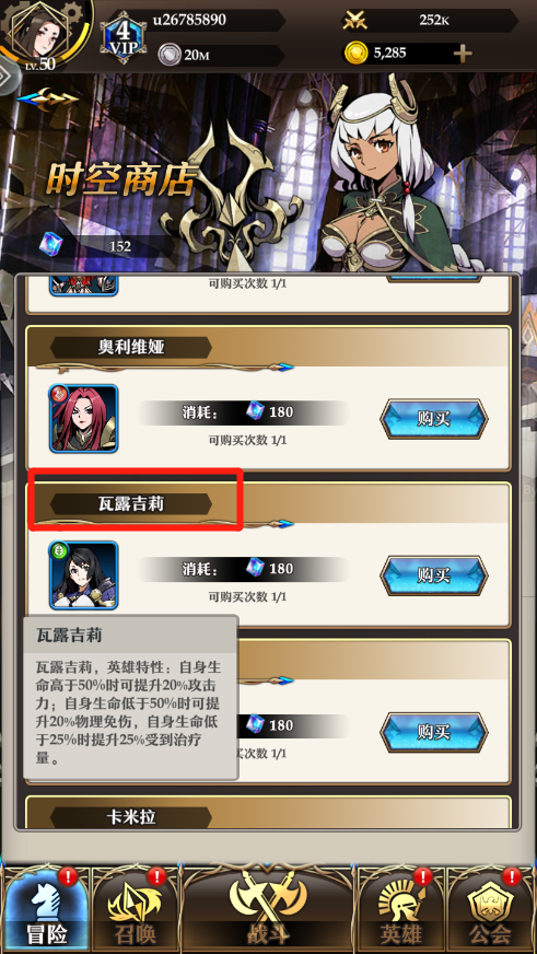 1、瓦露吉莉信物:玩家可以使用瓦露吉莉信物兑换完成瓦露吉莉,集齐50个可以召晚瓦露吉莉,英雄特性为自身生命高于50%时可提升20%攻击力;自身生命低于50%时可提升20%物理免伤,自身生命低于25%时提升25%受到治疗量。