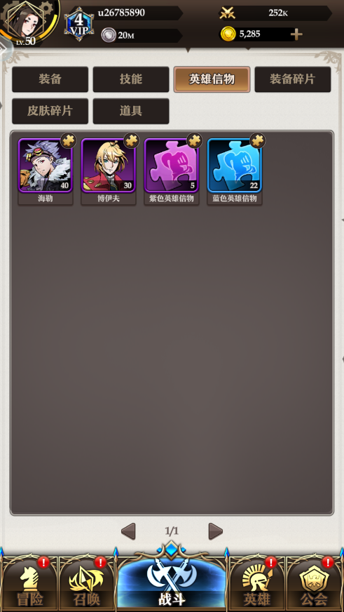 2、蓝色英雄信物:集齐50个可随机召晚一位英雄。