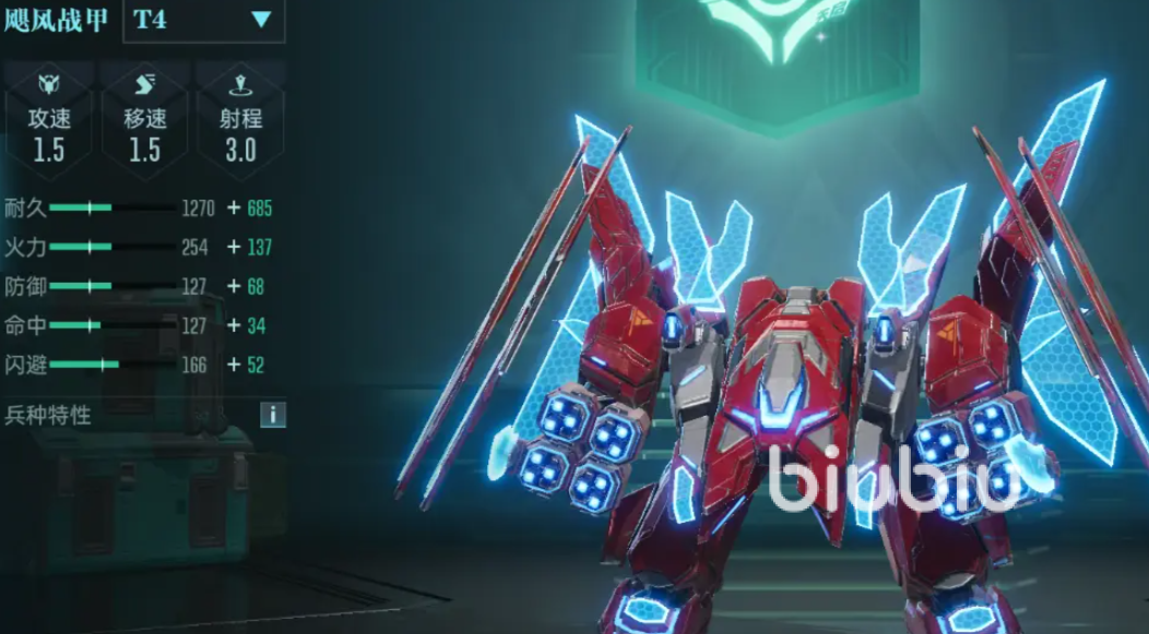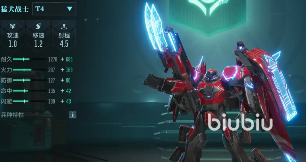 它拥有有全兵种中最高的闪避,生存能力比较强,可以在靠前方位置输出,不管在资源打矿还是PVP战斗都有不错的发挥,它最大的特点是拥有地面和空中两个形态,可以针对不同类型的敌人进行出击,其中前者形态用火炮攻击,能对敌方地面目标形成更高伤害,适合应对地面敌人,而后者姿态会用导弹攻击,对空中目标形成更高输出,适合应对空中敌人。