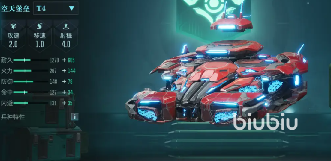 空天堡垒是大体型兵种里的火力担当,攻击距离较远在兵种里能排到第二,最突出的特点就是拥有高额的单次攻击伤害,虽然攻击频率较低,但每次形成的大量伤害可以弥补这个缺点,它可以在战斗中进行形态转换,普通形态下会用导弹武器攻击,只会攻击但个目标,舰船形态不光攻击距离增加,还可以同时攻击3个目标,但该形态下会失去移动能力。
